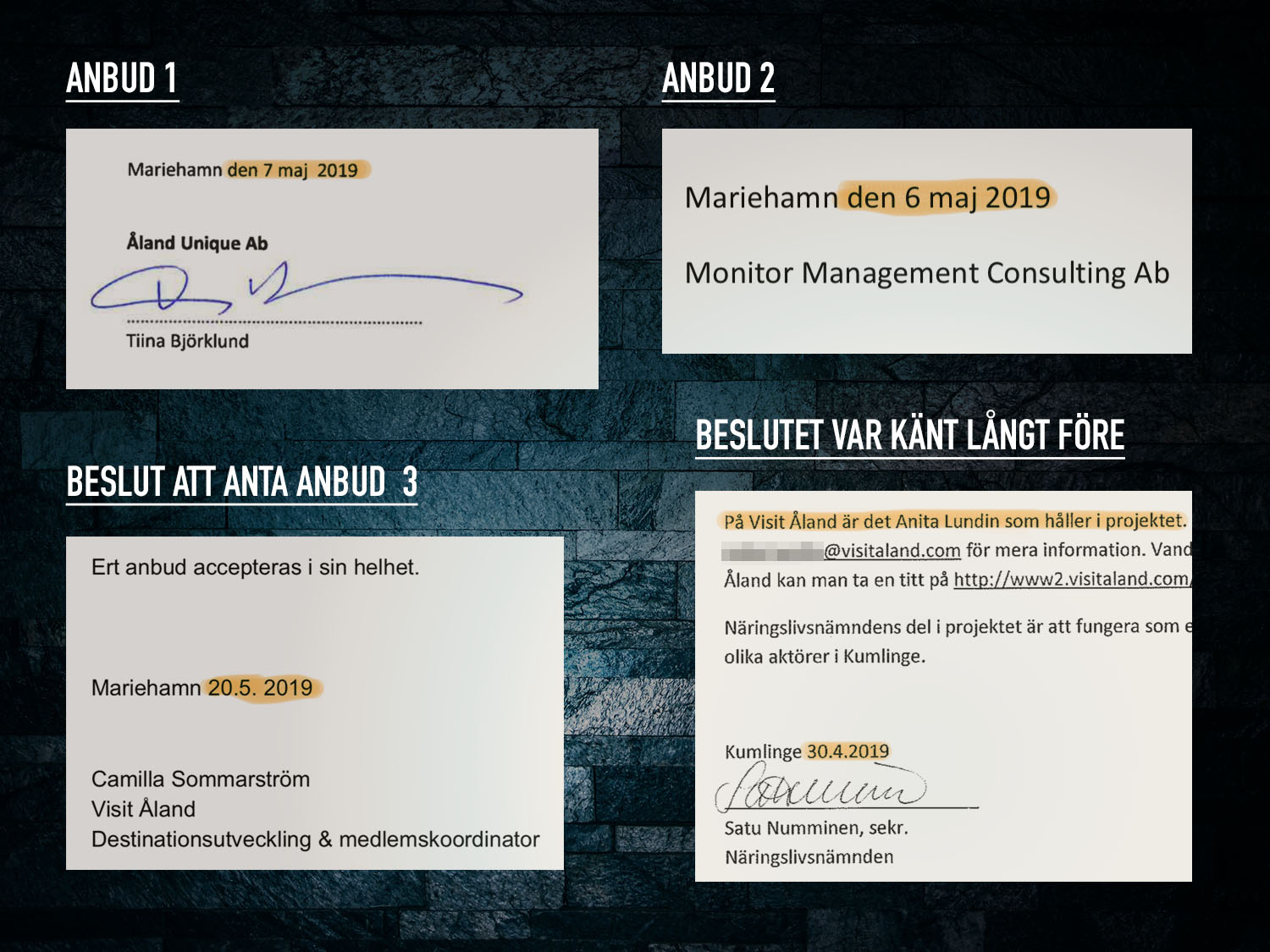 I dokumenten som Ålands Nyheter får av landskapsregeringen framgår det att Anita Lundins offert var den billigaste utav tre anbud som begärts in av Visit Åland. Det framgår också att Anita Lundin tidigare varit anställd hos Visit Åland och att en annan av de tre personerna som fick chans att ge anbud på projektet är en kvinna som är anställd på chefsposition hos Visit Åland för närvarande.